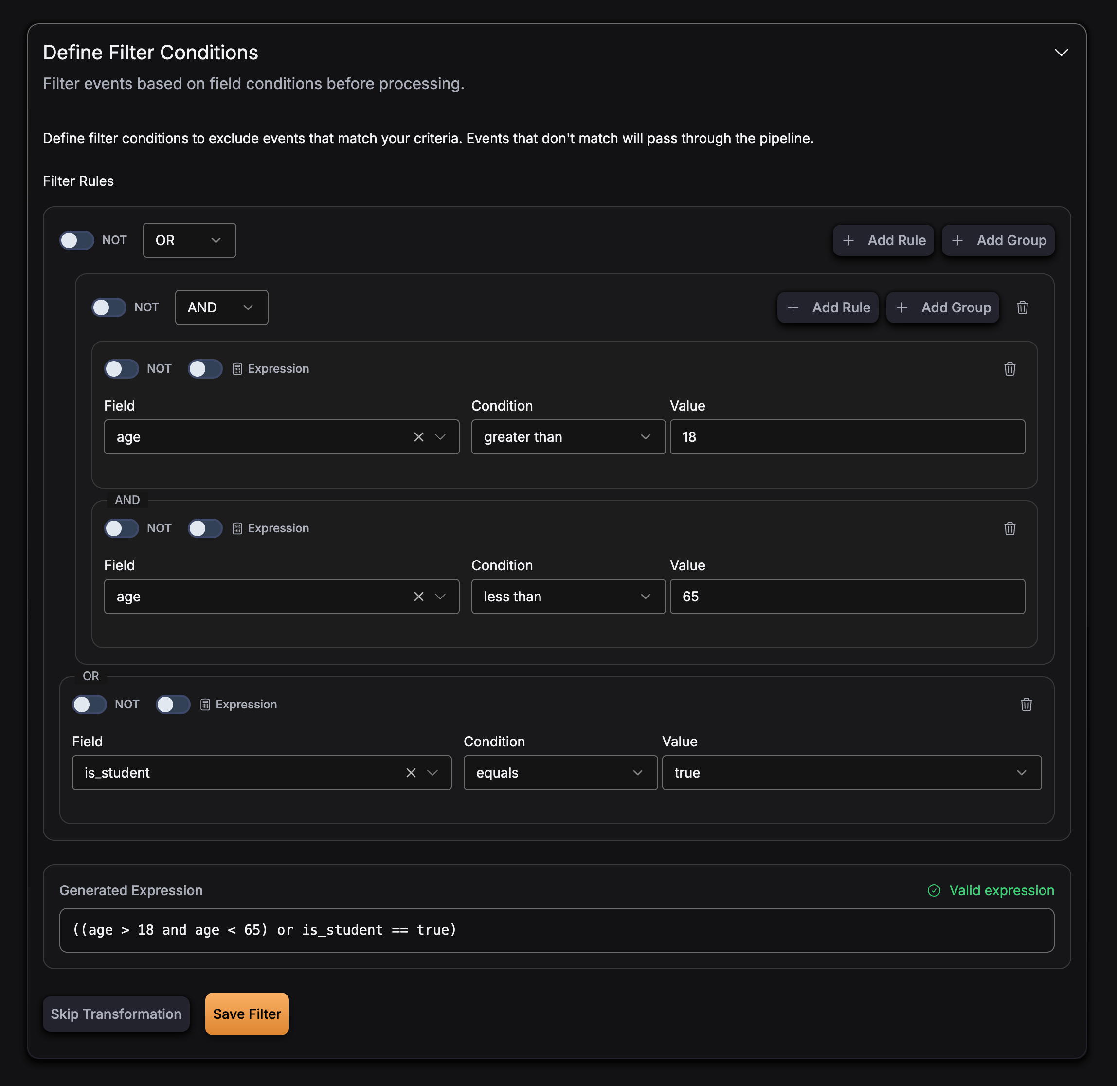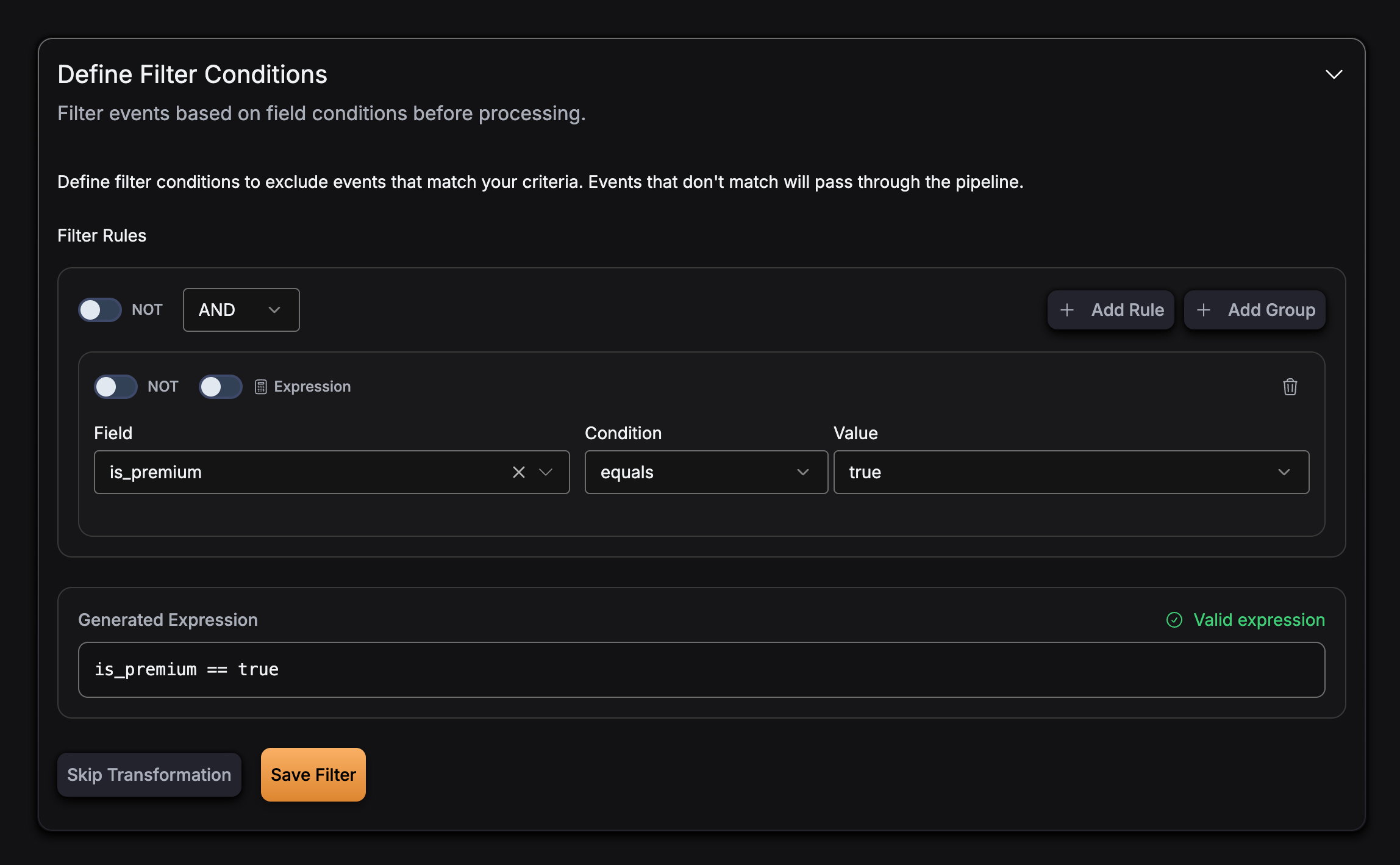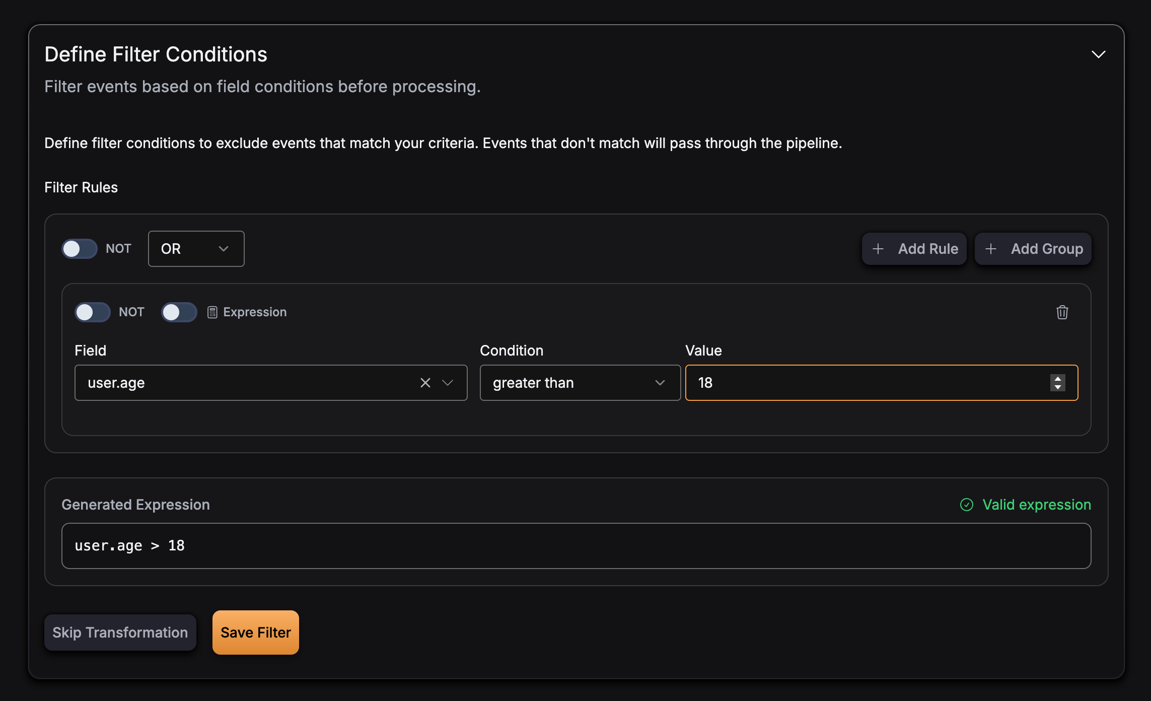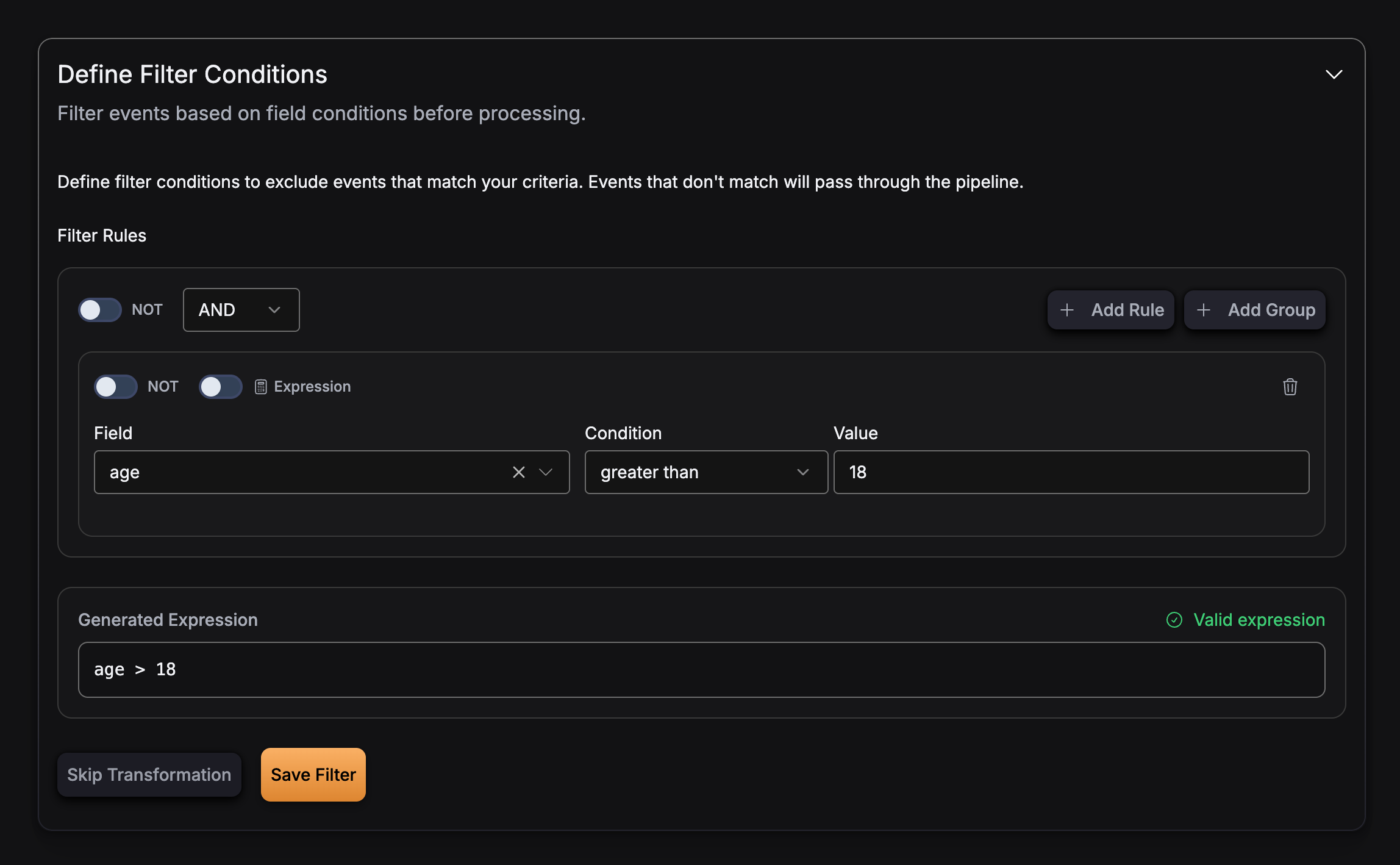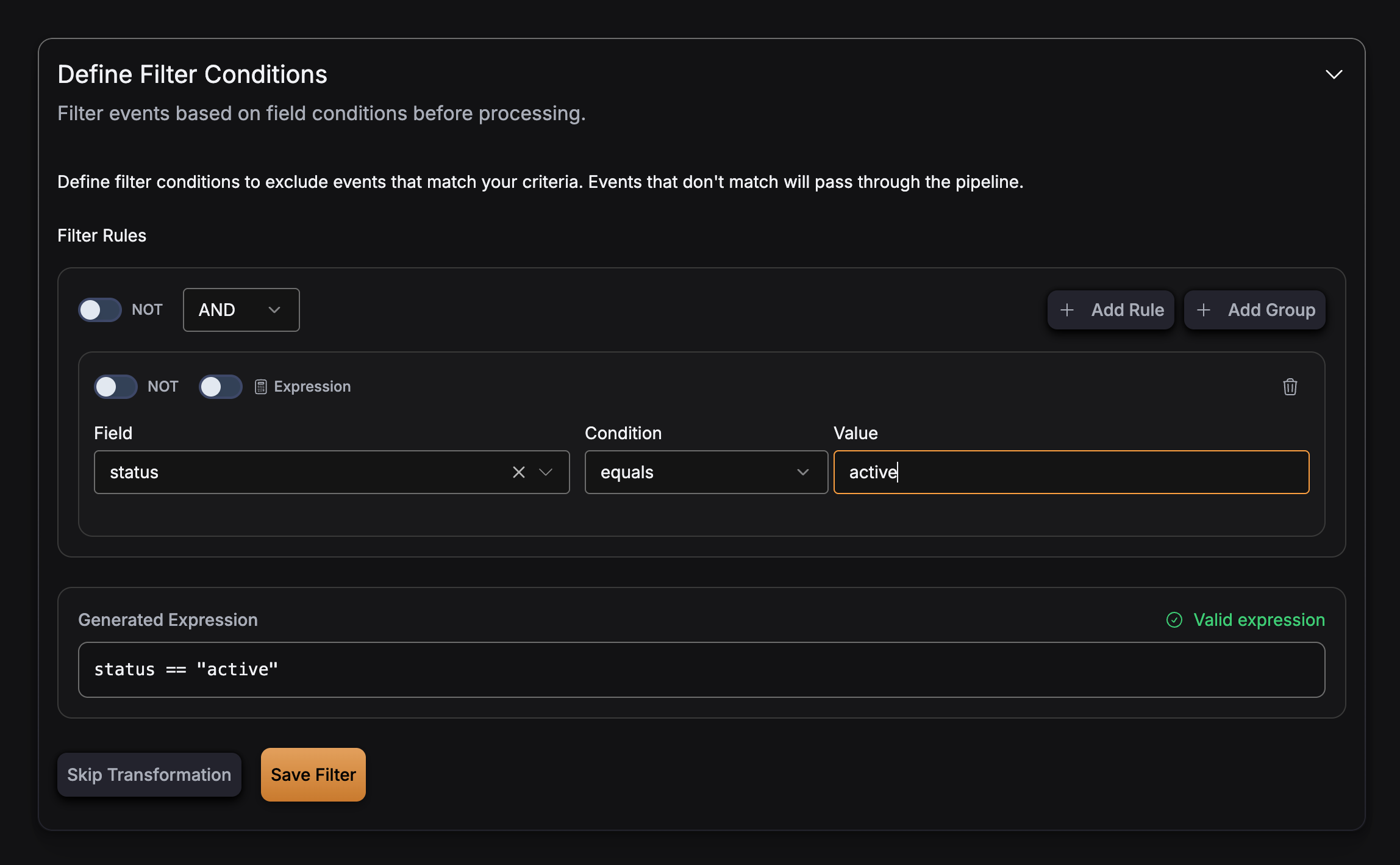 The Filter transformation allows you to selectively process events based on configurable expressions. Events that match the filter expression are processed further in the pipeline, while non-matching events are filtered out and not processed.